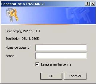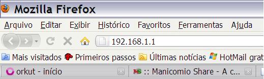 Na barra de endereços do navegador digite: 192.168.1.1 e pressione a tecla ENTER. Abrirá uma caixa de texto solicitando nome de usuário e senha.